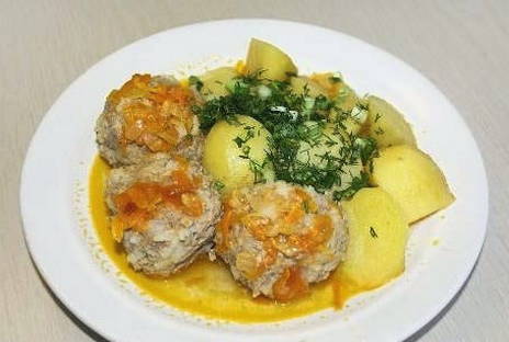Een kant-en-klaar gerecht voor een heerlijke warme lunch - gehaktballen met aardappelen in tomatensaus. Je hoeft het bijgerecht niet apart te bereiden. Verzamel een heerlijk recept dat u tijd zal besparen.