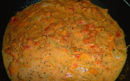 - Giet de tomatensaus in de schaal en laat nog 15 minuten sudderen.