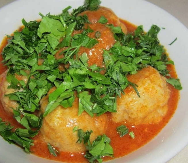 - Smakelijke koolvis gehaktballetjes in tomatensaus