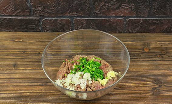 - Doe het gehakt in een diepe kom. Roer het met zout en kruiden.