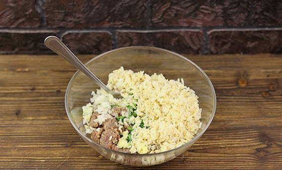 - Combineer gehakt afzonderlijk met gekookte rijst, zout en kruiden.