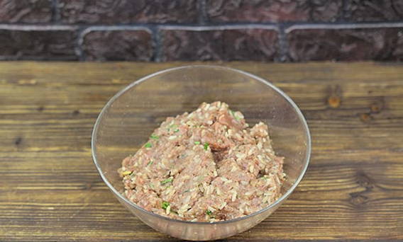 - Combineer gehakt, gekookte rijst, kippenei en de helft van de gesnipperde ui in een diep bord. Voeg zout en peper toe aan de massa en roer het door.