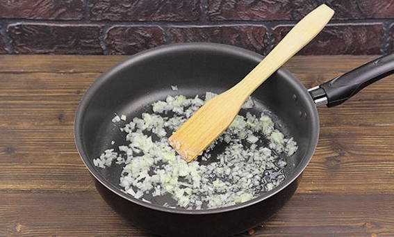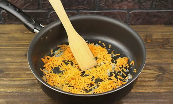 - We beginnen met koken door gesnipperde uien en geraspte wortelen te bakken. Voedsel in olie koken tot het zacht is.