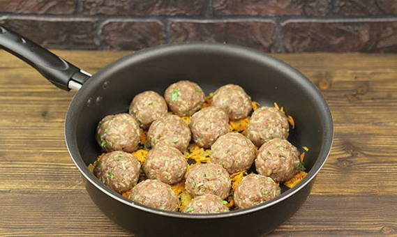 - Wij boetseren kleine balletjes van gehakt. We zetten hun ovenschaal, gieten over de bereide tomatensaus. Bak 30 minuten in een voorverwarmde oven op 180 graden.
