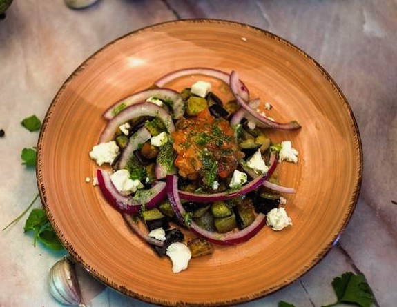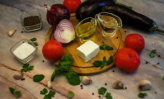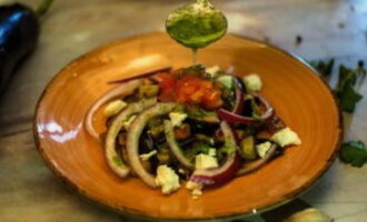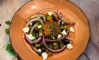 Vorm de salade in porties. We leggen de aubergines op borden. Hiermee sturen we halve ringen uien en kleine blokjes tomaten. Giet de dressing over de traktatie en maak het af met plakjes fetakaas.