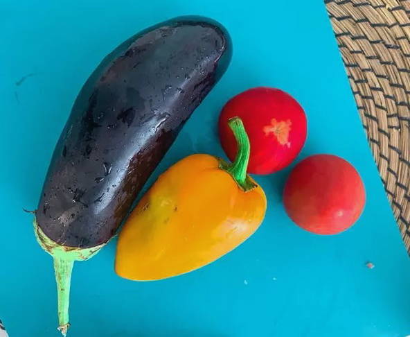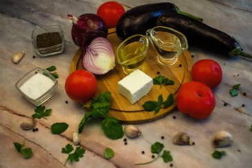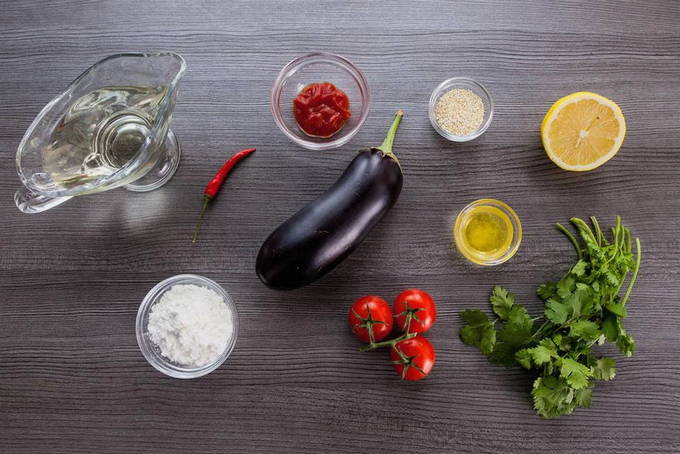 Eerst meten we de benodigde hoeveelheid van alle ingrediënten af. We wassen de groenten zorgvuldig onder water. Het is niet nodig om de schil van jonge aubergines af te pellen.
