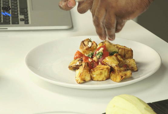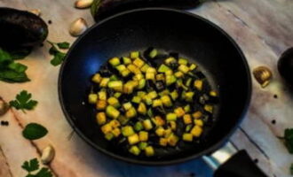 Verwarm een koekenpan voor met plantaardige olie. De voorgesneden aubergineblokjes dompelen we hier onder, zout ze naar smaak. Bak het product tot het bloost.