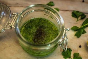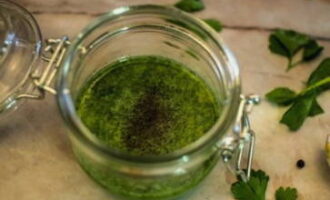 Kneed de saladedressing apart door elkaar. Om dit te doen, combineer olijfolie, gehakte knoflook, peterselie en kruiden naar smaak.
