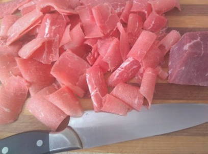 - Snijd het rundvlees in dunne plakjes. Dit is handig als je een licht bevroren stuk vlees gebruikt.