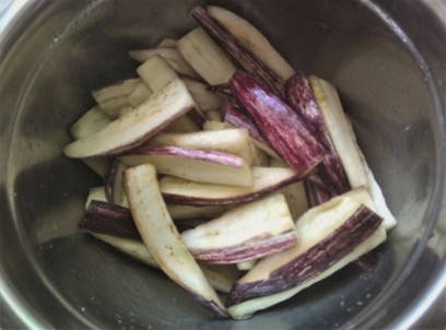 - Snijd op dit moment de aubergine in dikke reepjes en laat deze 20 minuten in gezouten water weken.