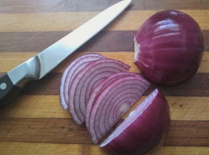 - Snijd de ui in dunne halve ringen en laat deze samen met de aubergine sudderen tot de groenten zacht zijn.