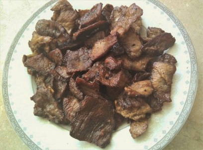 - We verspreiden het afgewerkte rundvlees op een bord.