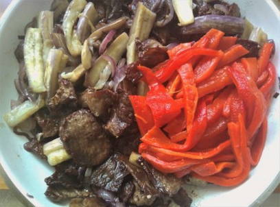 - Bak vervolgens de aubergines met peper.