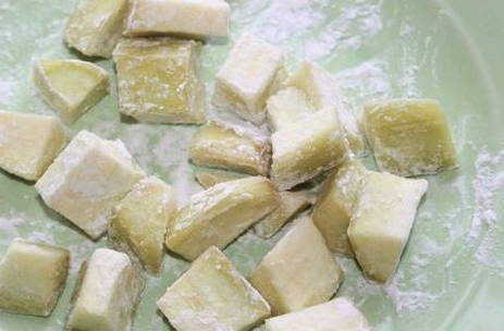 - Schil en snijd de aubergine in blokjes. Rol ze goed door het zetmeel en frituur ze tot ze knapperig zijn.