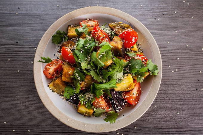 Warme salade van krokante aubergine in zoetzure saus