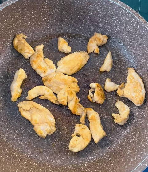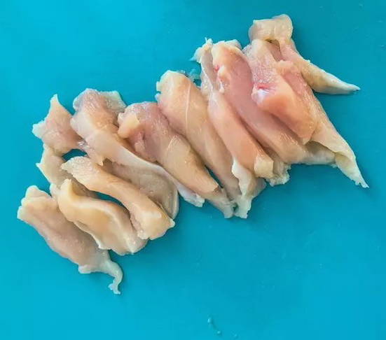 - Kipfilet ontdooien en in dunne reepjes snijden.