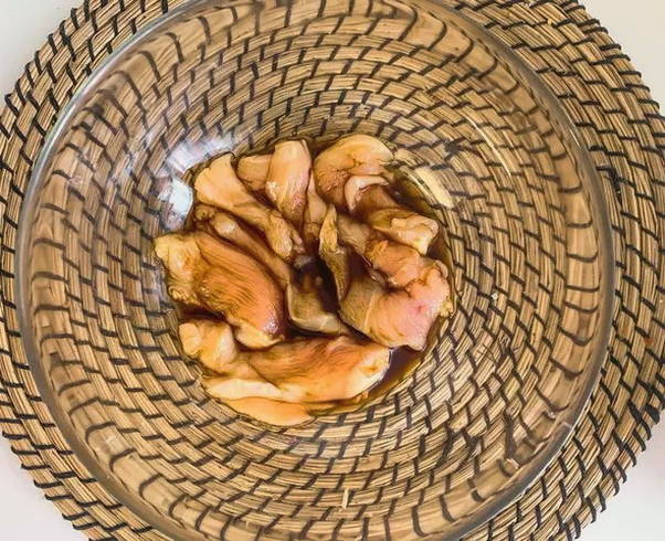 - Dompel het vlees in een diepe kom en vul het gedurende 10-15 minuten met sojasaus.