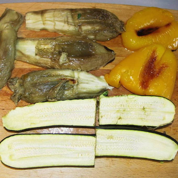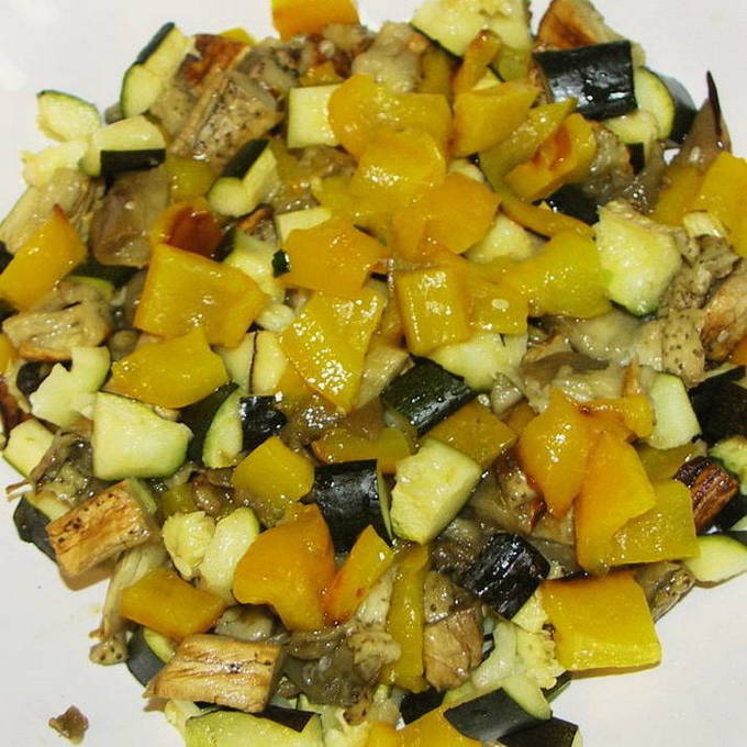 - We snijden de gebakken groenten in kleine blokjes, die we op een gemeenschappelijk bord leggen.
