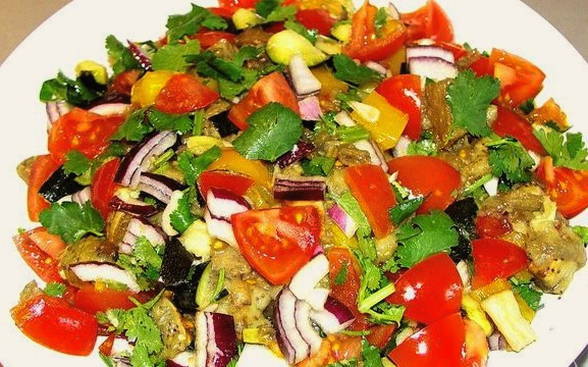 Een geurige warme auberginesalade wordt gemaakt met de toevoeging van koriander. Een helder gerecht wordt een hoogtepunt van uw familietafel. Daarnaast is het idee relevant voor het vakantiemenu.