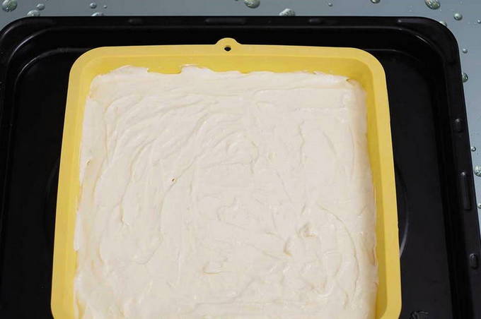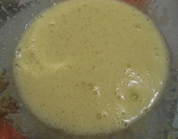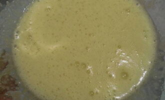 - Maal eieren met suiker, voeg dan bloem, bakpoeder, zout en gesmolten boter toe. Kneed het voedsel goed tot er een dik deeg ontstaat.