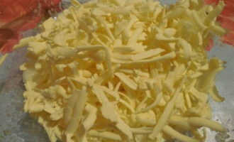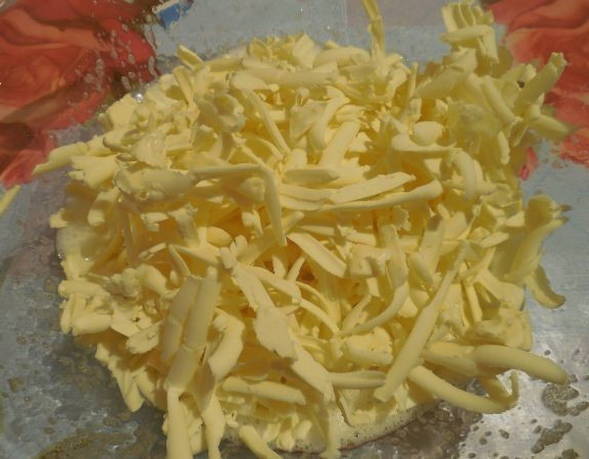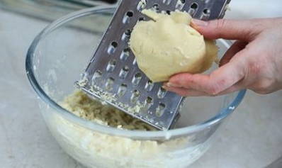 - Wrijf de boter op een grove rasp. We spreiden het werkstuk in een diepe plaat.
