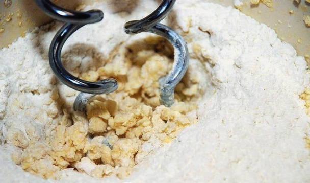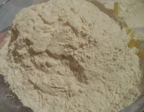 - Zeef de bloem en bakpoeder in een diepe kom. Wrijf hier boter in.