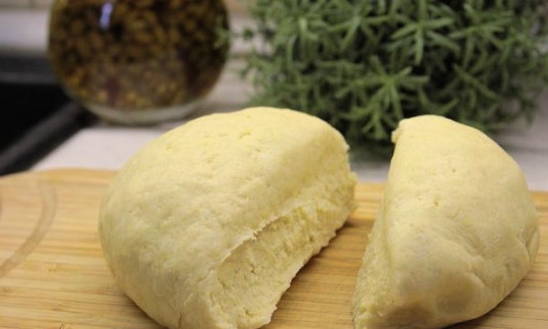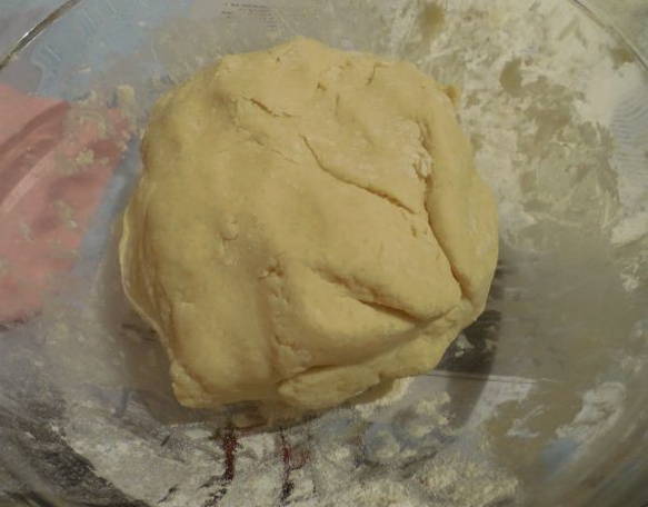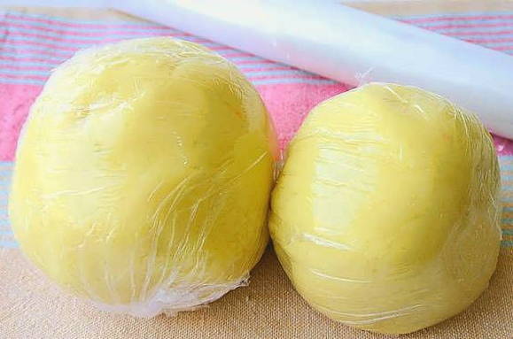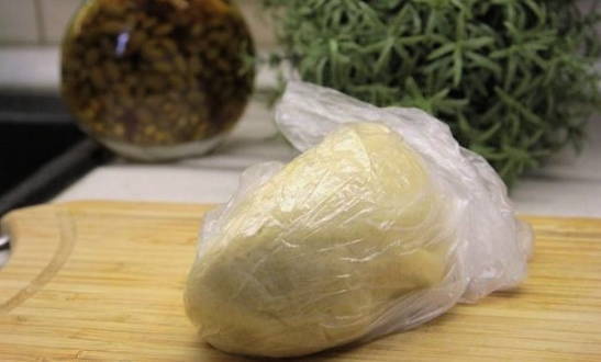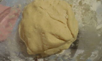 - We combineren het vloeibare mengsel met het droge. Kneed tot een dicht deeg. We scheiden een klein deel en stoppen het in de vriezer. Rol het resterende product uit.