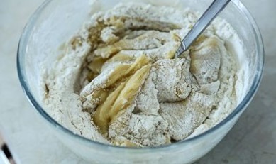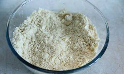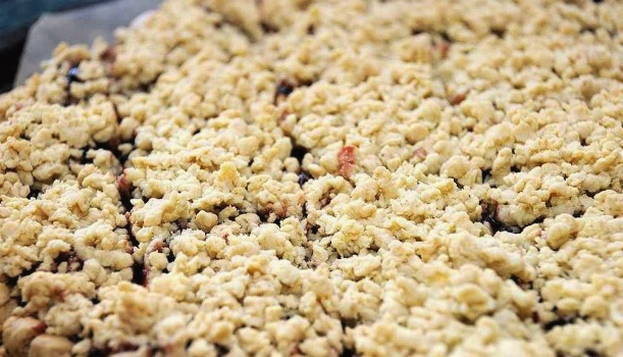 - Meng de rest van het deeg met 50 gr. meel. Vervolgens malen we het product en bestrooien we de vulling met de resulterende kruimel.