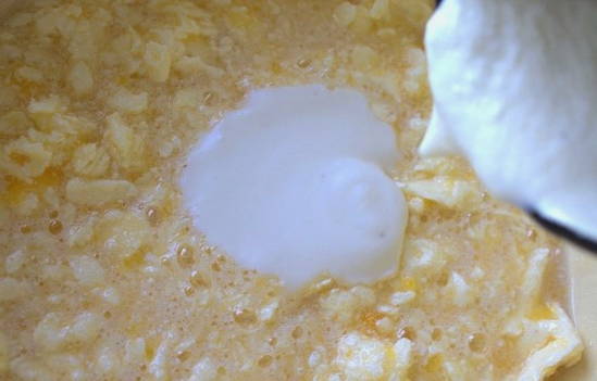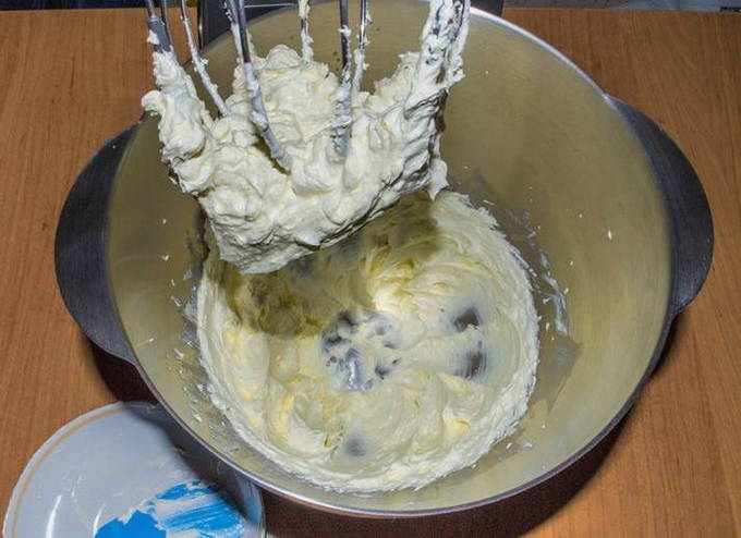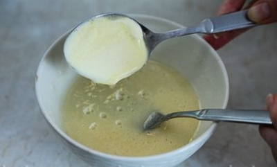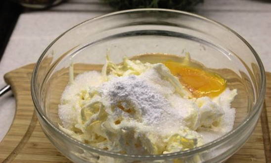 - Klop met een mixer tot een luchtige massa is gevormd. Voeg geleidelijk het ei en de zure room toe. Voeg dan bloem met bakpoeder toe.