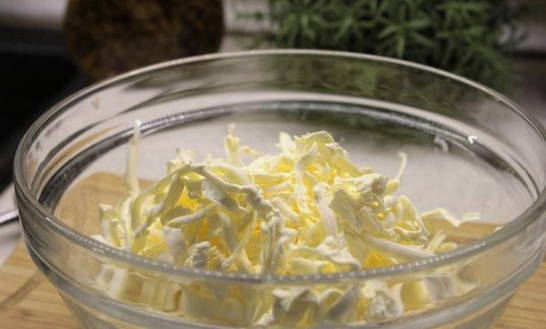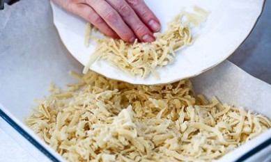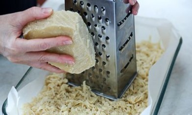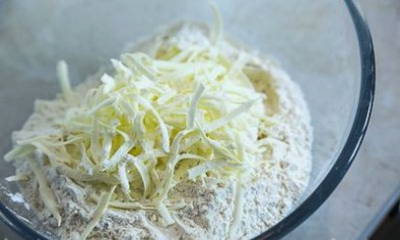 - Leg het deeg 40 minuten in de vriezer. Wrijf het na het bevroren product op een grove rasp.