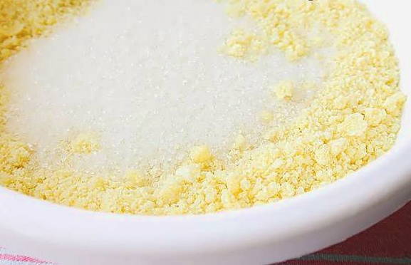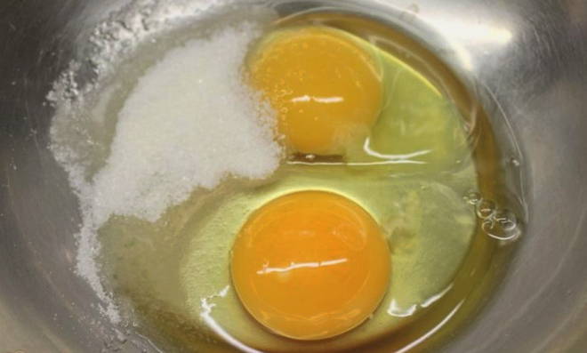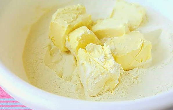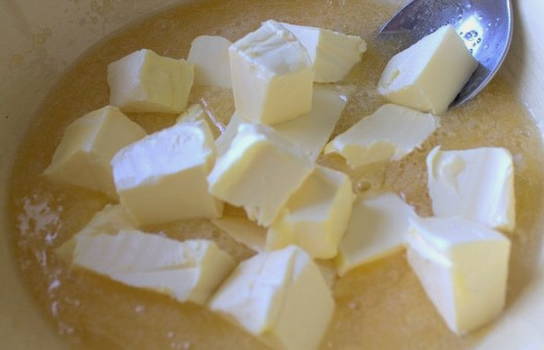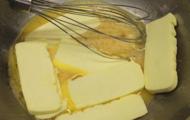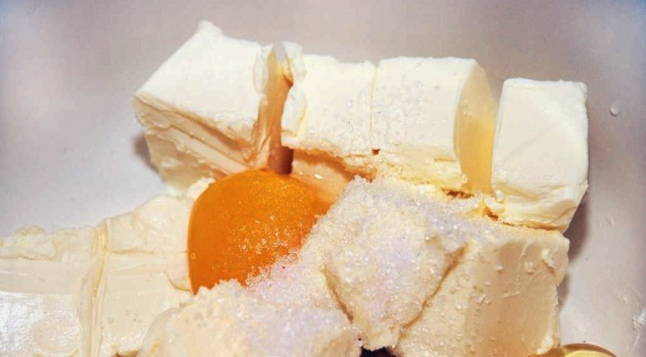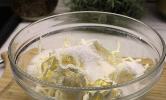 - Snijd de boter in blokjes. Combineer het ingrediënt in een diepe kom met suiker en kippeneieren.