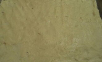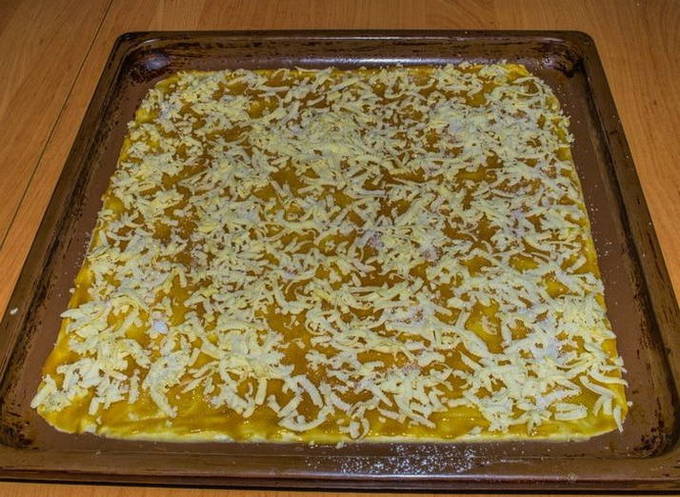 - Bestrooi de vulling met de geraspte massa. We bakken het gerecht 20 minuten op een temperatuur van 200 graden.
