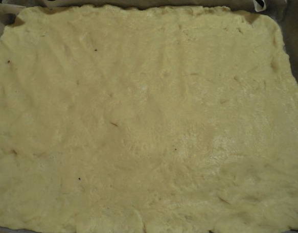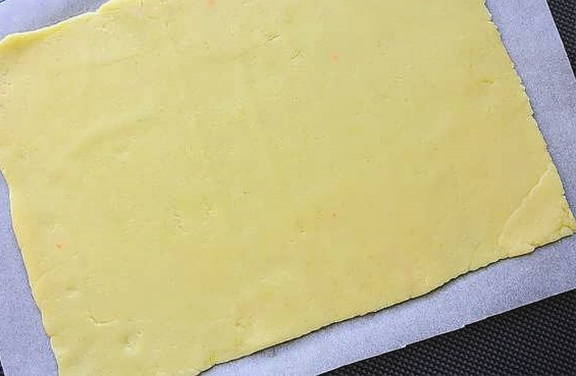 - Rol de resterende klont tot een gladde dunne laag. We leggen het op een bakplaat met perkament.