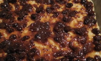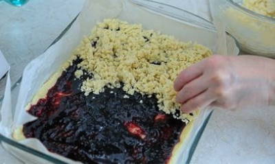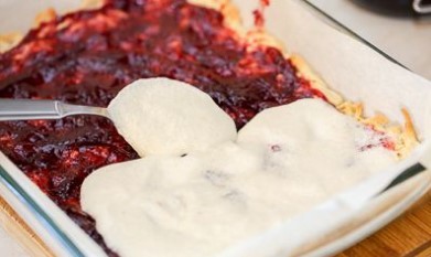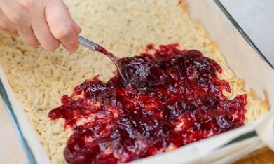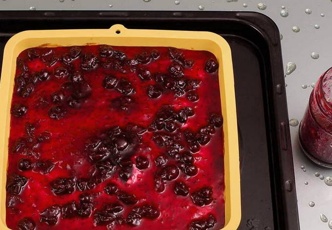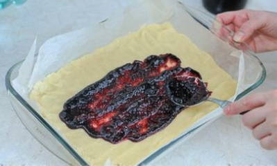 - Leg de deeglaag stevig vast met je handen, bedek deze gelijkmatig met jam.