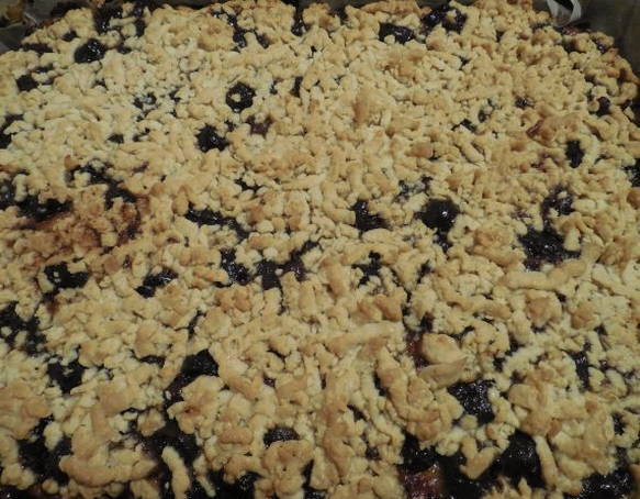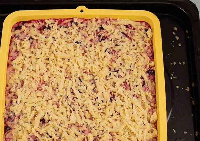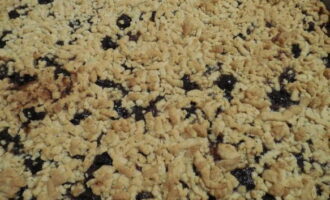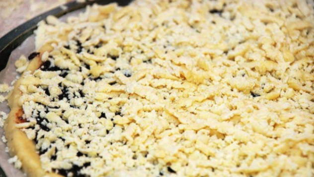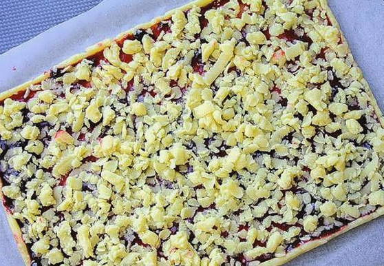 - Rasp het bevroren deeg. Giet de vulling met de resulterende kruimel. We bakken 15-20 minuten op een temperatuur van 180 graden
