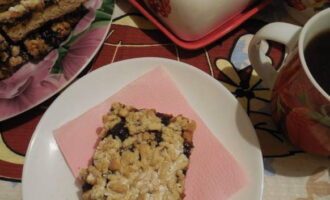 - We halen het resterende deeg uit de vriezer, wrijven het in en verdelen het over de vulling. We bakken het werkstuk 20 minuten op een temperatuur van 200 graden.