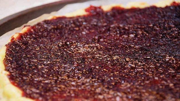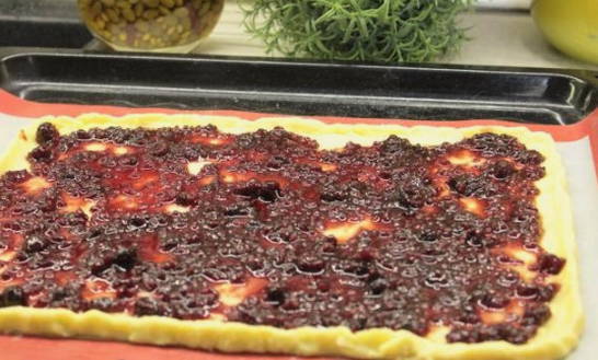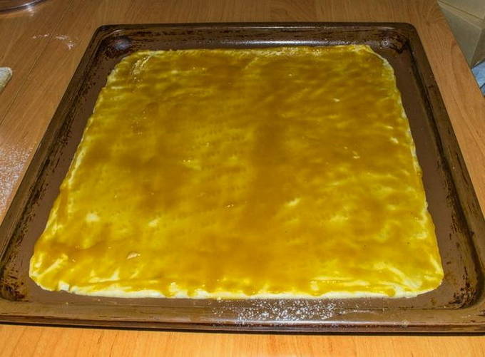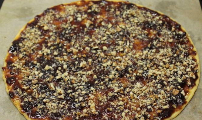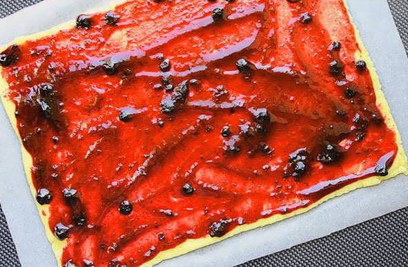 - Bedek het oppervlak van het deeg met een dun laagje jam.