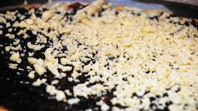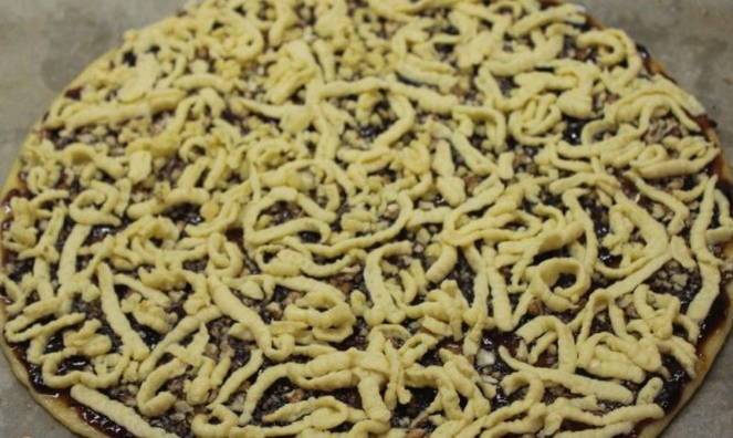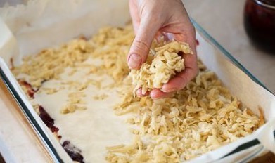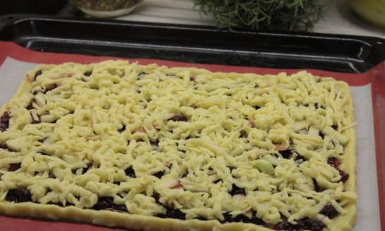 - We vormen een taart. Bedek de opgerolde laag met jam en bestrooi deze met geraspt bevroren deeg.