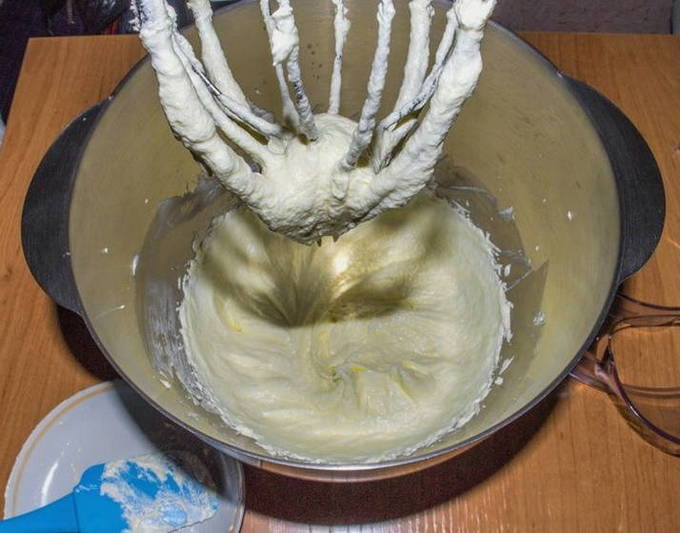 - Op dit moment kunt u de wrongelvulling bereiden. Klop de kwark, kippeneieren en suiker goed los. Er moet een weelderige massa uitkomen.