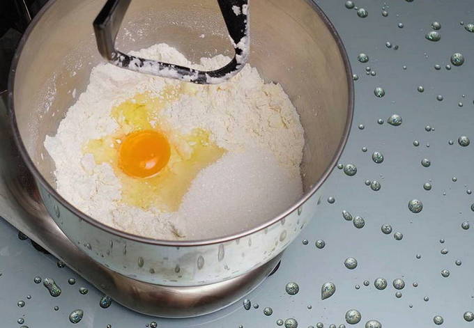 - Om het deeg te maken, zeef je eerst de bloem. Voeg er vervolgens suiker, kippenei en zachte boter aan toe. We kneden de producten tot een stevige klont.
