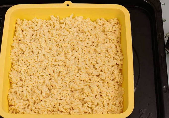 - Rasp het bevroren deeg. We verspreiden het meeste in een dikke laag in een ovenschaal.