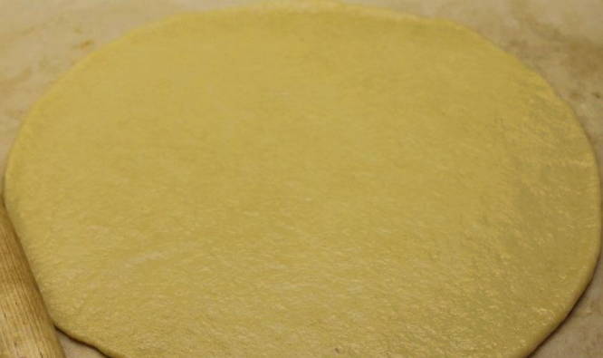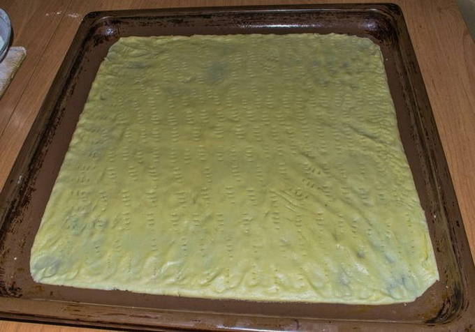 - Scheid een klein stukje van het resulterende deeg en leg het in de vriezer. Rol de rest van het product dun uit en leg op een bakplaat.
