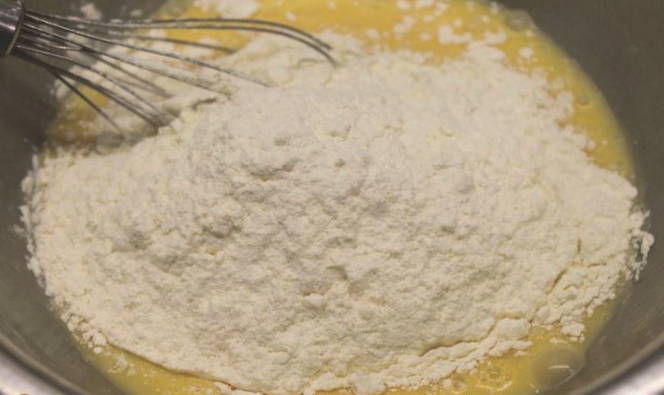 - Giet bloem gezeefd met bakpoeder in het warme mengsel.