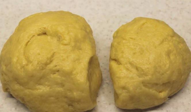 - Verdeel het deeg in twee ballen. De een moet kleiner zijn dan de ander. We zetten de kleine in de vriezer.