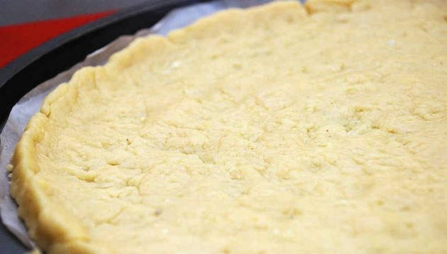 - We halen het deeg uit de koelkast en rollen het in een dunne laag. We schuiven de basis op een bakplaat, steken de randen iets in.