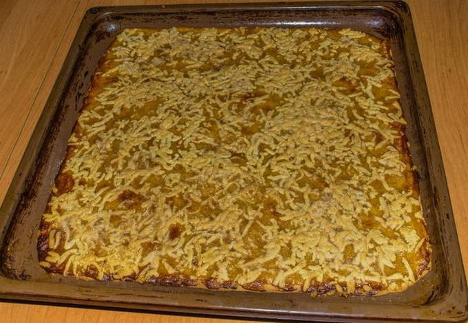 - Bestrooi de vulling met de rest van het geraspte deeg. We bakken het gerecht 20 minuten op 180 graden.