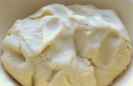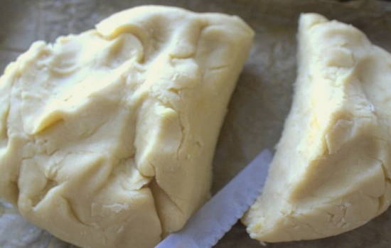 - Kneed het deeg tot het stevig is. We verdelen het in twee delen. De een moet kleiner zijn dan de ander. We leggen het even in de vriezer.