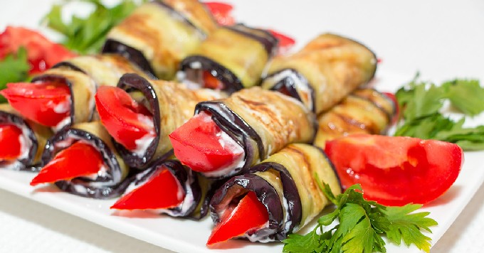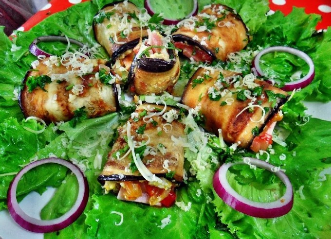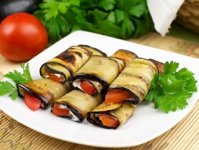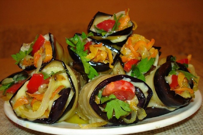 - Snijd de afgekoelde gekookte aubergines in lange dunne borden. Leg ze op een bakplaat, dek af met een snijplank erop, waarop een pot water staat. Aubergineplakken moeten 4-5 uur onder het gewicht blijven. Bak daarna de stukjes aubergine in een beetje plantaardige olie en laat afkoelen. Je moet frituren totdat de aubergines een aangename gouden tint krijgen.