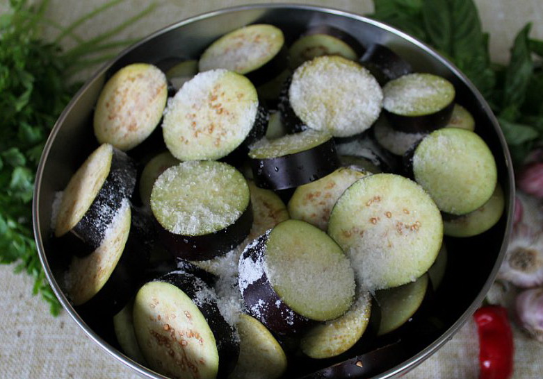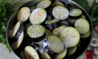 - Om onze wintersalade mals en ongelooflijk lekker te maken, moet je alle bitterheid uit de aubergine verwijderen. Om dit te doen, spoelt u ze af met koud water en knipt u vervolgens de paardenstaart af. Nu moet je alle aubergines in ringen van ongeveer 3-5 millimeter dik snijden. Doe de in plakjes gesneden aubergines in een grote pan en bestrooi met voldoende zout. Roer en laat de aubergine ongeveer 2 uur staan. Gedurende deze tijd zou alle bitterheid moeten verdwijnen.