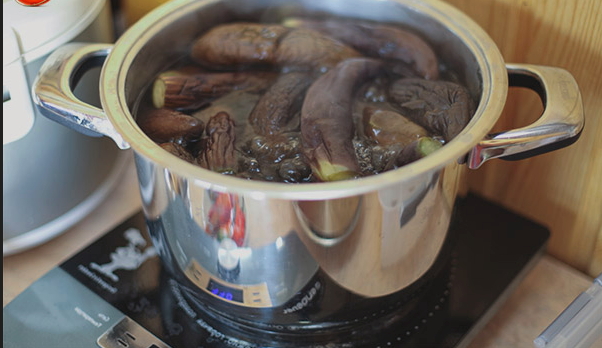 - Was de aubergines en snij het deel af waar de steel aan vast zit. Neem een grote pan, doe er hele aubergines in, voeg ½ kopje zout toe en bedek met water zodat het de groenten volledig bedekt. Zet de pan op het vuur en breng aan de kook. Nu moet je de aubergines koken tot ze gaar zijn. De kooktijd is sterk afhankelijk van de grootte van de groente. Als de aubergines zacht zijn, zijn ze klaar.